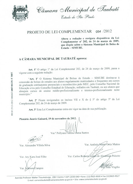 A Câmara Municipal de Taubaté aprovou por unanimidade em duas votações, na tarde desta quarta-feira, 21, projeto de lei complementar 054/2012 que altera as regras do Simube – Sistema Municipal de Bolsas de Estudo – para estudantes carentes da cidade.